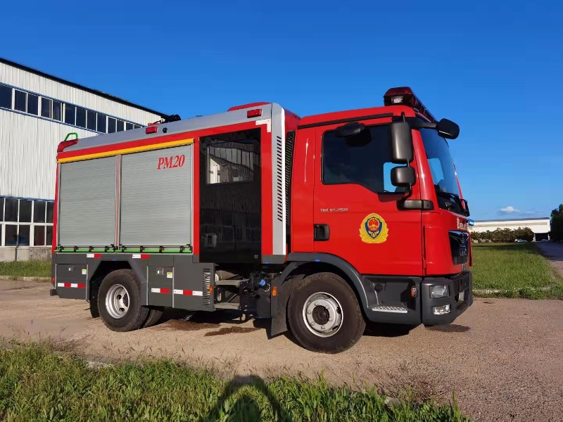 壓縮空氣系統采用集成模塊式系統 ,結構緊湊、性能優良、操作簡便,空間利用率高。 車輛底盤為德國曼TGL12.250型底盤,發動機型號MAN DO836LFLAK,功率為184kw,國六排 放標準,軸距3050mm,罐體材質采用耐低溫高分子化合物,容罐容量:水1900kg,A類 泡沫200kg;消防泵為50FBU(美國希爾);集成式壓縮空氣泡沫系統,型號:PTO- CAFS120型,型式:全自動壓縮空氣A類泡沫系統,曲臂升降照明系統,主照明燈功率: 216W×2,移動照明燈功率:500W×2只,升降桿:鋁合金,云臺:鋁合金,水平垂直旋 轉角度:420°,牽引絞盤系統為杭州天銘FEW13500,大流量消防水槍。