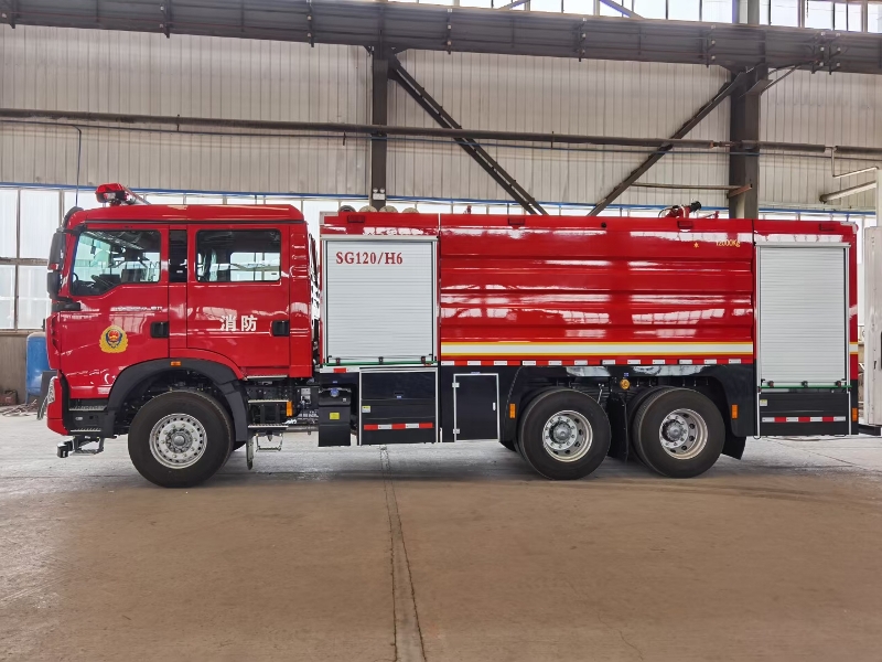 車輛底盤為豪沃ZZ5357TXFV464MF5底盤,發動機型號MC11.46-61,功率:341kw,國六排放標準,軸距4300mm+1400mm,罐體材質:優質碳鋼板;容罐容量:水12000kg; 消防泵為雄真CB10/60-XZ;消防炮為威斯特PS50W。