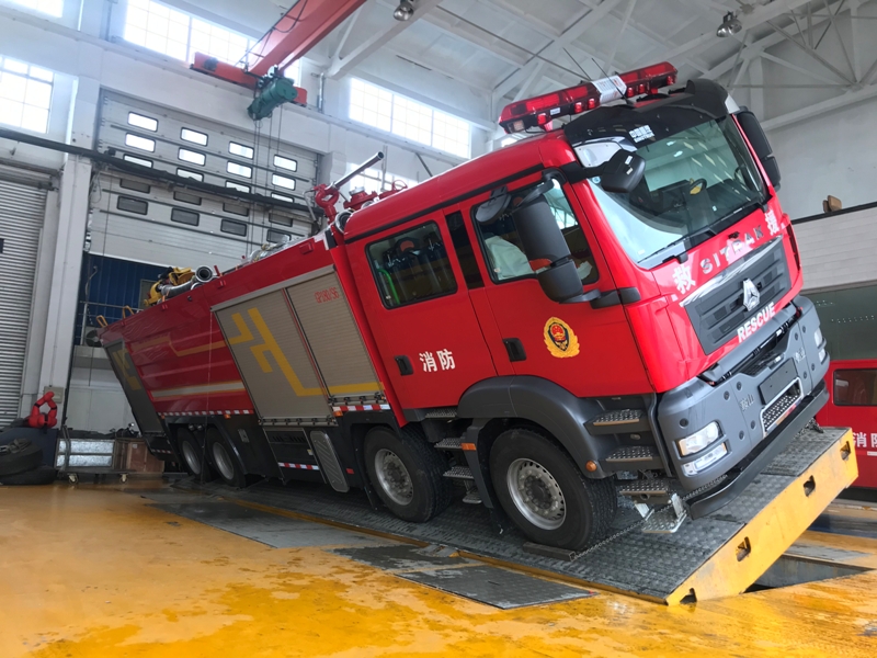 車輛底盤為汕德卡ZZ5446V516MF5底盤,發(fā)動(dòng)機(jī)型號(hào):MC13.54-61,功率:400kw,國(guó)六排放標(biāo)準(zhǔn),軸距:1950+4500+1400mm,罐體材質(zhì):優(yōu)質(zhì)不銹鋼304,容罐容量:水10000kg,泡沫5000kg,干粉罐額定充裝量:3000kg,消防泵為8FGR-美國(guó)Hale(希爾),消防炮為泡沫水兩用炮,型號(hào)為DICODOPLUS 150法國(guó)POK博克,干粉炮為萃聯(lián)PF40,照明系統(tǒng)為星際,主照明燈功率:600W×4 整車由底盤、罐體、箱體、管路、干粉氮?dú)庀到y(tǒng)、照明系統(tǒng)等主要結(jié)構(gòu)組成,罐體采用優(yōu)質(zhì)不銹鋼304。設(shè)計(jì)厚度:4:4:3(底板:側(cè)板:防蕩板);箱體主骨架為優(yōu)質(zhì)型鋼,蒙板為優(yōu)質(zhì)氧化鋁合金平板粘接結(jié)構(gòu)。全鋼框架焊接結(jié)構(gòu),左右后三側(cè)為鋁合金卷簾門,車身右后側(cè)設(shè)上爬梯,下設(shè)防滑翻轉(zhuǎn)踏板。器材箱內(nèi)骨架采用鋁合金型材內(nèi)藏式搭接技術(shù),可提高空間利用率和可變性,內(nèi)部底板采用鋁花紋板,內(nèi)蒙板與框架之間采用粘接技術(shù)(無(wú)鉚釘)。管路系統(tǒng)由外進(jìn)水管路、內(nèi)進(jìn)水管路、出水管路、注液管路、泡沫管路、放余水管路、冷卻水管路、全自動(dòng)泡沫比例混合器組成。干粉罐材質(zhì)為16MnR,配有裝粉口、排粉口、氮?dú)廨斔凸芎统龇酃埽迌?nèi)氮?dú)廨斔凸転榄h(huán)行并配多個(gè)進(jìn)氣閥,使氣體與干粉混合均勻呈流態(tài)。