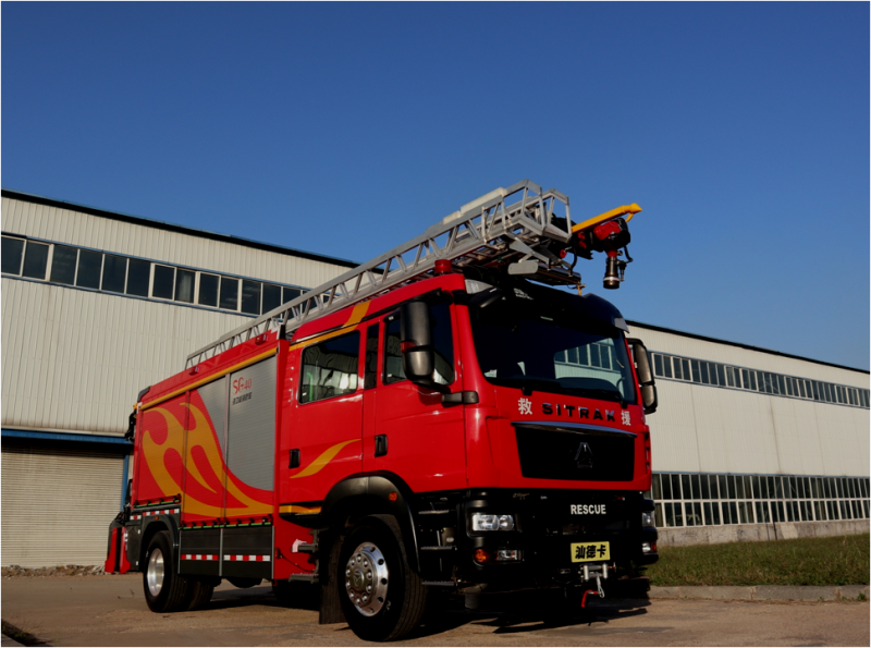 車輛底盤為汕德卡ZZ5206N471GF5底盤,發動機型號MC07H.35-60,功率:257kw,國六排放標準,軸距:4700mm,罐體材質:耐低溫高分子化合物PP;容罐容量:水4150kg;消防泵為美國大力,型號為KSP1000;流量:60L/s;消防炮為美國阿密龍,型號為3482+5177;照明系統:發電機功率為5.5Kw;牽引絞盤系統:杭州天銘,型號為FEW16500;折疊式車載吊機系統:希爾博型號為HIAB X-CL111B-2;舉升高度15m。